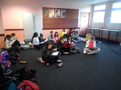 Les tables et chaises ayant été enlevées de la salle, les élèves disposent d’un vaste espace pour chanter et travailler en petits groupes.