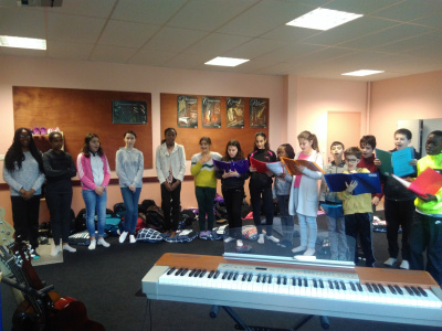 Les élèves se mettent en arc de cercle devant le piano pour chanter.