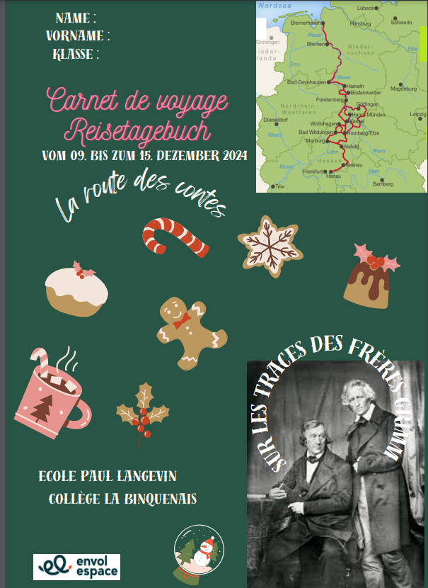 C’est un voyage ambitieux pour les élèves du Cycle 3 qui approche à grands pas ! Depuis plus d’un an, nous préparons avec Madame NEAU, la directrice de l’Ecole élémentaire Paul LANGEVIN ce voyage sur les traces des frères GRIMM. Le 9 décembre 2024, 26 élèves de CM2 qui apprennent l’Allemand et 26 élèves de 6° Bilangues anglais/allemand partiront une semaine découvrir la vie des frères GRIMM, leurs contes et bien entendu les marchés de Noël si prisés en Allemagne. Les 7 enseignants encadrants sont heureux de partir et de concrétiser la liaison Cycle 3 Ecole/Collège. De nombreux enjeux découlent de ce projet innovant, préparé de longue date : Développer l’autonomie chez nos élèves, faire que la mobilité européenne prenne tout son sens, élargir et enrichir les parcours citoyen, avenir et culturel… Voici le programme et le trousseau de cette semaine qui s’annonce riche en découvertes.